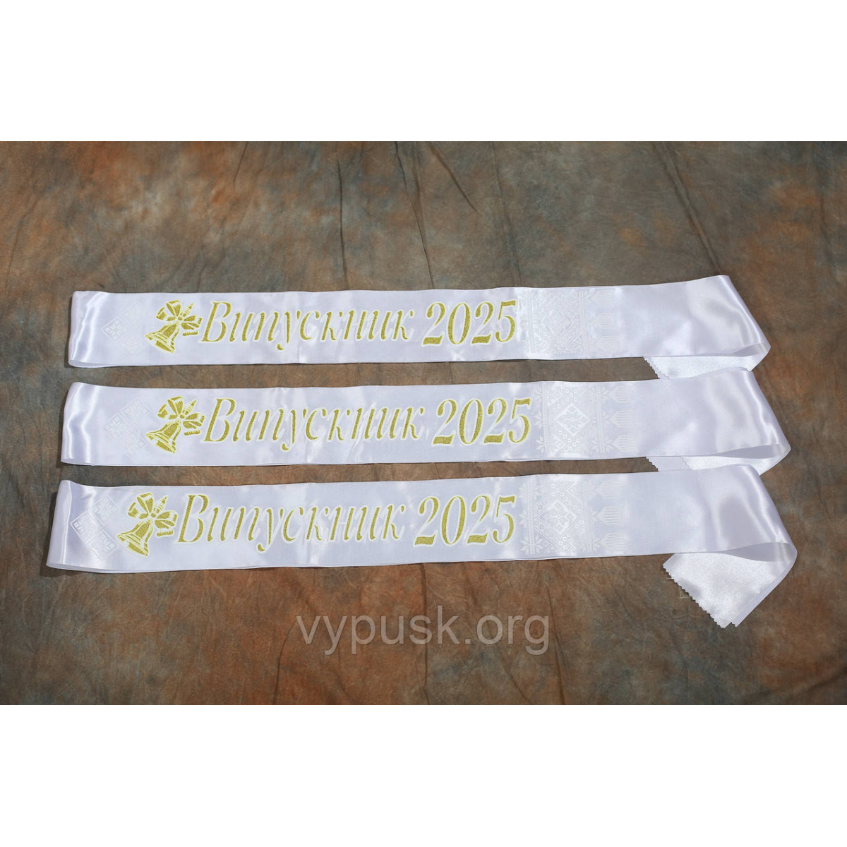 Стрічка “Випускник 2025“ біла атласна з 3 Д написом і золотим глітером.